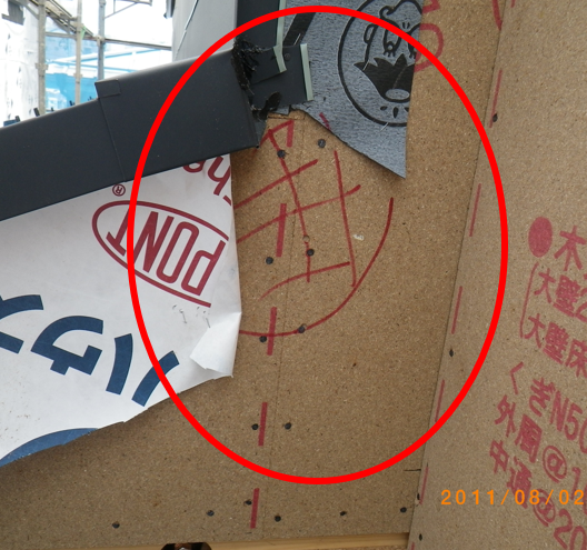 下屋端部の増し張りがありません。角は壁材を切断した時に必ず穴が出来てしまいます。その部分は防水シートで覆う様に隠さなければいけません。中途半端にすると浸水し腐食します。最悪はシロアリが発生します。